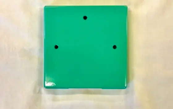溶融亜鉛メッキの上に粉体塗装しております。富士電装では溶融亜鉛メッキの表面調整から始めます。溶融亜鉛メッキの独特の物・タレの肌を除去し、溶融亜鉛メッキ後の粉体塗装で発生する気泡を限りなくフラットな塗装面に仕上げます。