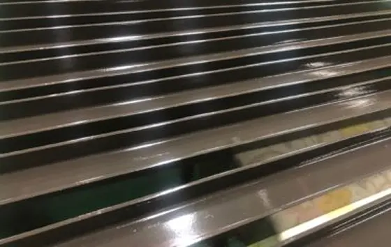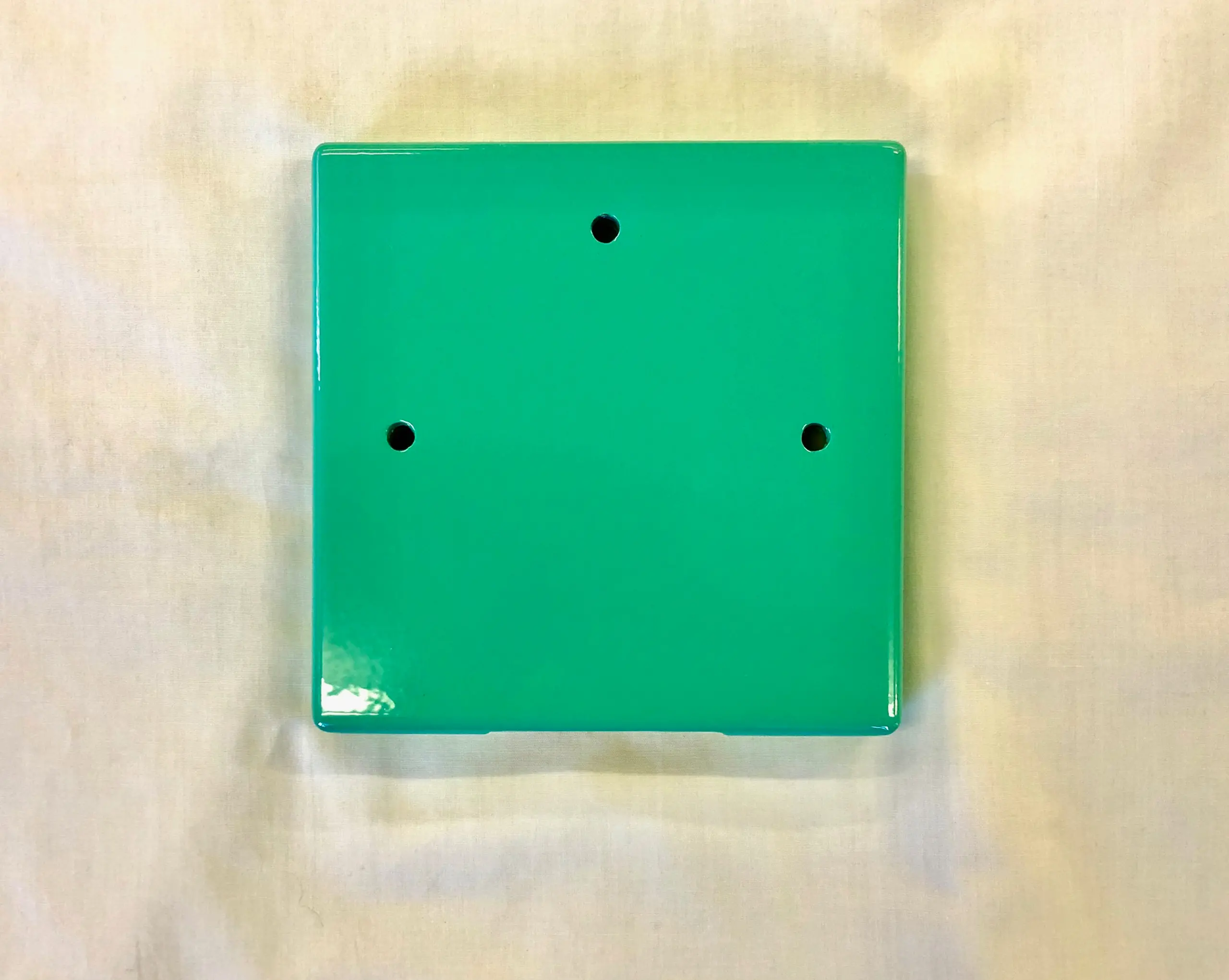 溶融亜鉛メッキの上に粉体塗装しております。富士電装では溶融亜鉛メッキの表面調整から始めます。溶融亜鉛メッキの独特の物・タレの肌を除去し、溶融亜鉛メッキ後の粉体塗装で発生する気泡を限りなくフラットな塗装面に仕上げます。